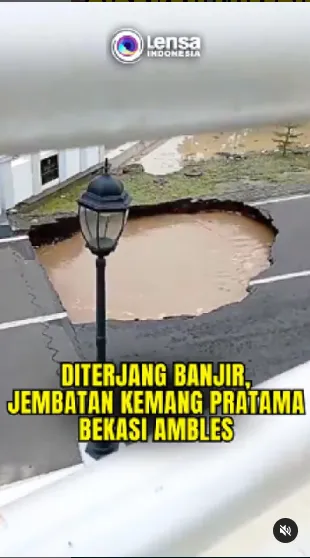 Jembatan Kemang Pratama yang berada di Kelurahan Sepanjang Jaya, Kecamatan Rawalumbu, Kota Bekasi, Jawa Barat, ambles pada Selasa (4/3). Terlihat jelas dari rekaman video amatir, lubang besar berada di tengah jalan. Selain itu juga terlihat tumpukan sampah di bawah jembatan. Kejadian itu membuat akses jalan tak bisa dilalui sementara waktu. Kanit Lantas Polsek Rawalumbu AKP Suradi mengatakan, peristiwa itu terjadi setelah jembatan terimbas luapan air Kali Bekasi.