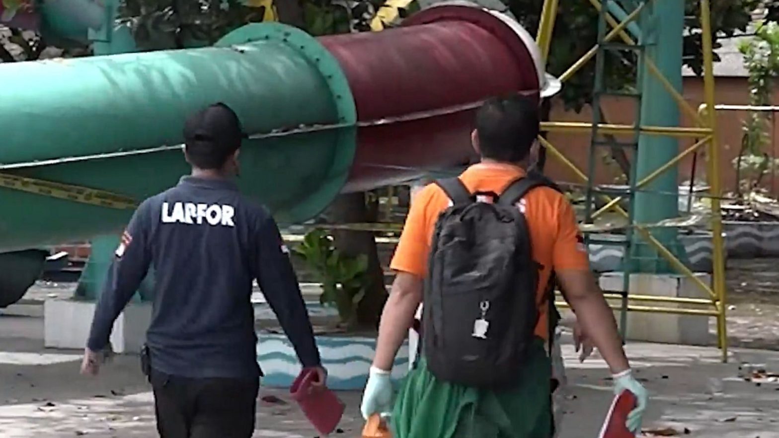 Polda Jatim menggelar olah Tempat Kejadian Perkara (TKP), terkait insiden ambrol nya seluncuran air di waterpark Kenjeran Surabaya. Tim labfor menguji kekuatan bahan fiber, untuk mengetahui kelayakan seluncuran air. Selain itu, petugas juga membawa beberapa potongan barang bukti untuk penyelidikan.
