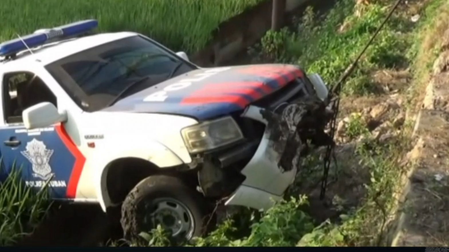 Mobil patroli Satlantas Polres Tuban, tercebur ke sawah usai ditabrak truk di Jalan Raya Babat-Surabaya, Desa Compreng, Kecamatan Widang, Kabupaten Tuban, Jawa Timur. Mobil patroli tersebut ditabrak truk, saat petugas sedang melakukan olah TKP kecelakaan di lokasi. Diduga sopir truk mengantuk hingga hilang kendali.