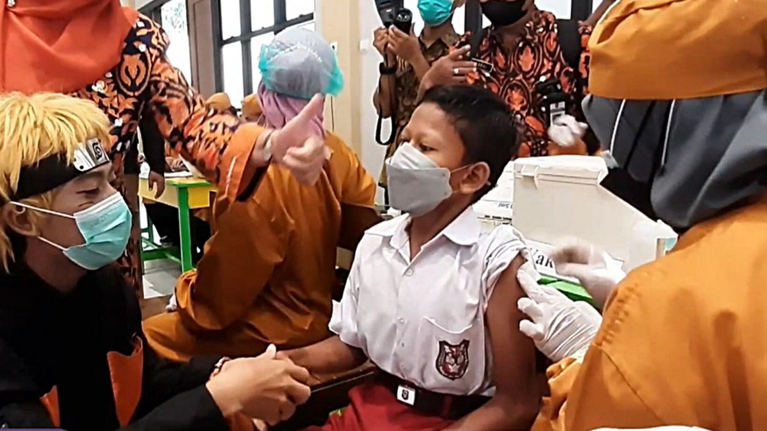 Ratusan siswa mengikuti vaksinasi untuk anak usia 6-11 tahun di SDN Kleco 1 dan 2, Solo, Jawa Tengah. Untuk menarit minat siswa, Pemkot Solo menyiapkan hadiah bagi para peserta vaksin. Pemkot Solo menargetkan vaksinasi bagi anak-anak ini akan selesai dalam 1 atau 2 bulan mendatang.