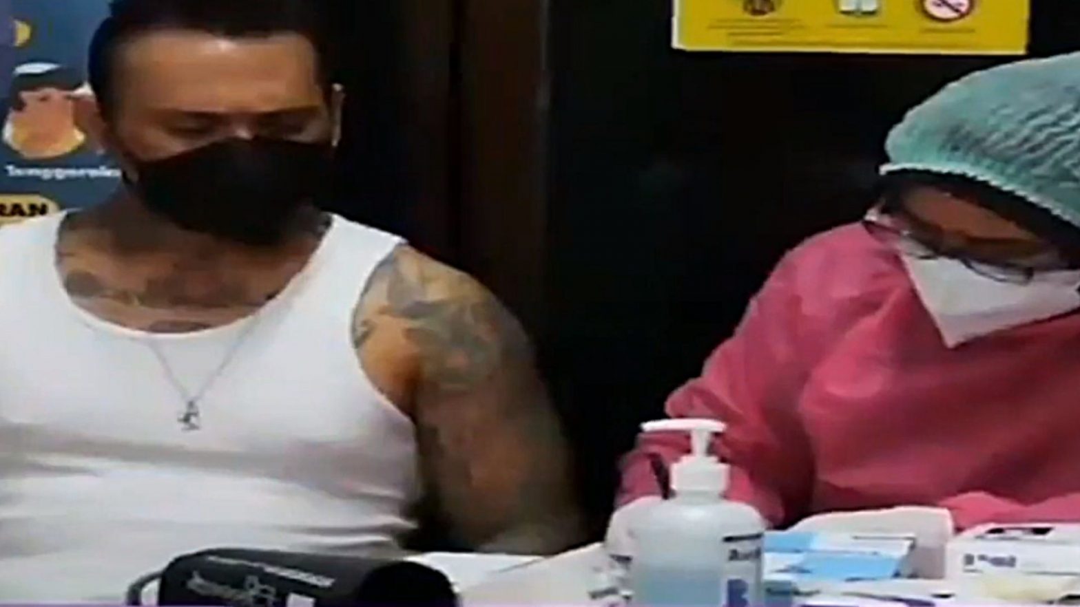 Drummer grup band Superman Is Dead (SID) I Gede Ari Astina alias Jerinx akhirnya bersedia menerima vaksin Covid-19 dosis pertama di Polda Metro Jaya, Jakarta, Minggu (15/8/2021). Sebelumnya Jerinx sempat menolak divaksin, akibat memiliki penyakit peradangan hati.