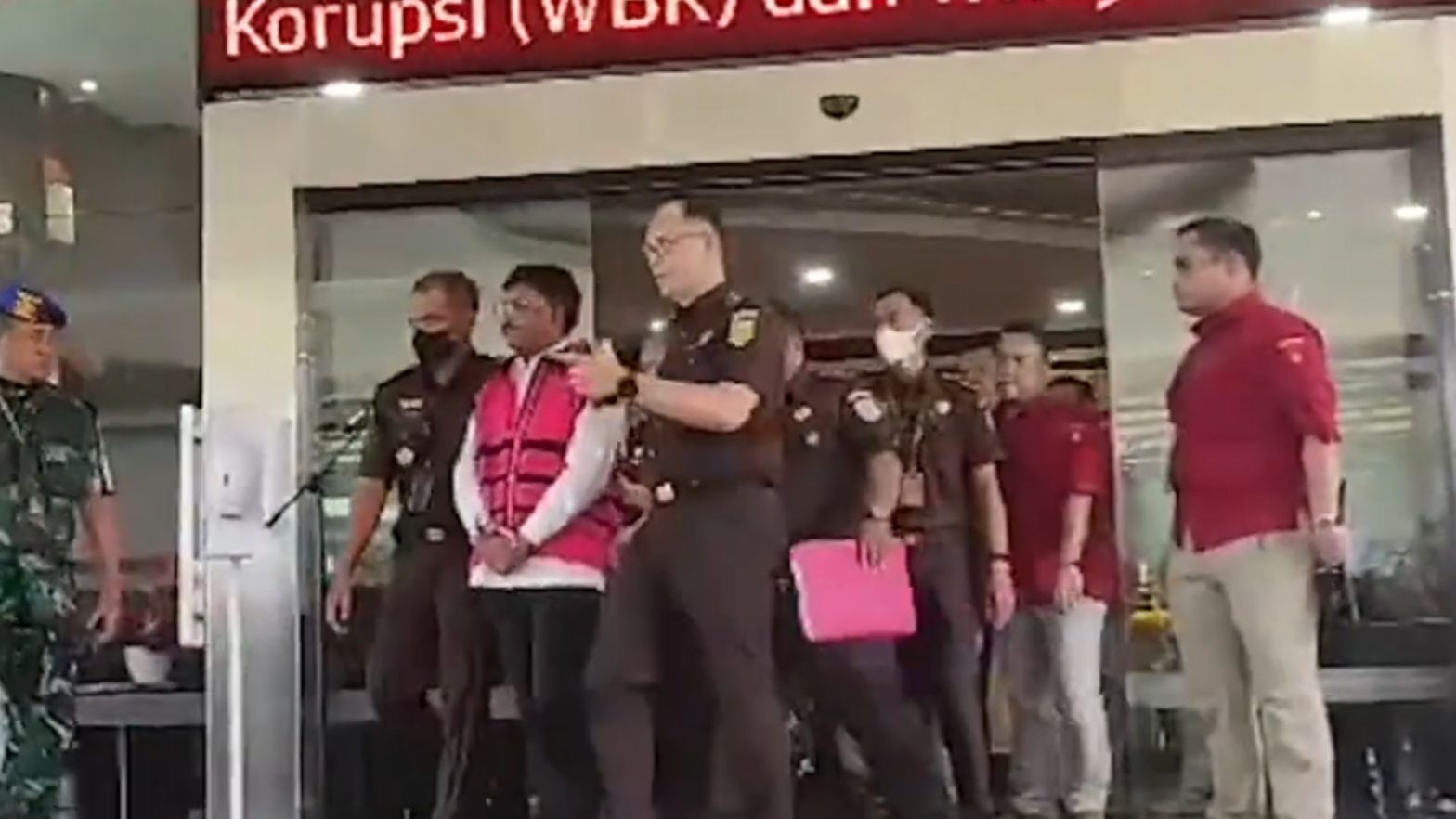 Menteri Komunikasi dan Informatika (Menkominfo) Johnny G Plate ditetapkan menjadi tersangka terkait kasus dugaan korupsi penyediaan menara base transceiver station (BTS) 4G dan infrastuktur pendukung 1, 2, 3, 4 dan 5 Bakti Kementerian Kominfo tahun 2020-2022. Usai ditetapkan sebagai tersangka, Johnny G. Plate keluar gedung Jampidsus Kejagung dengan menggunakan rompi tahanan Kejagung berwarna pink.