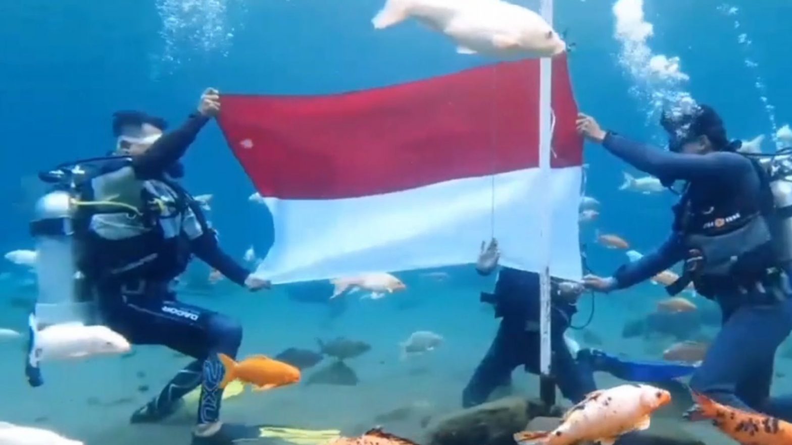 Jelang hari kemerdekaan ke-77 Republik Indonesia, pengelola objek wisata air Umbul Ponggok, Klaten, Jawa Tengah, menggelar pengibaran bendera dari kolam ikan. Uniknya, tidak hanya berhenti di bawah air, bendera kemudian dikerek naik ke atas permukaan air selayaknya upacara bendera. Beberapa pengunjung yang ada di pinggir kolam pun berdiri dan memberikan hormat kepada bendera, dengan diiringi lagu kebangsaan Indonesia Raya.