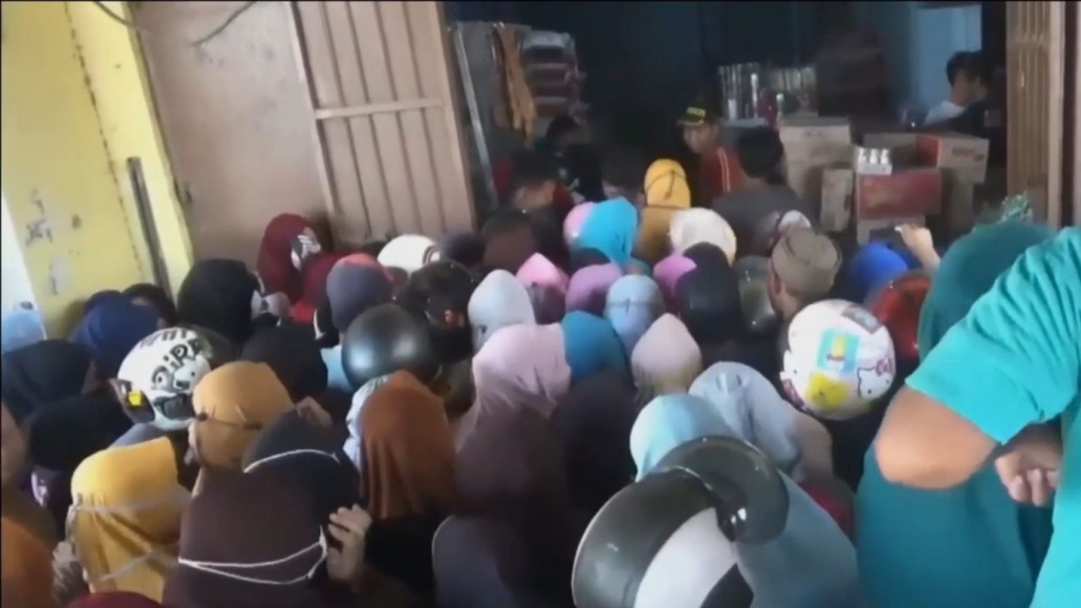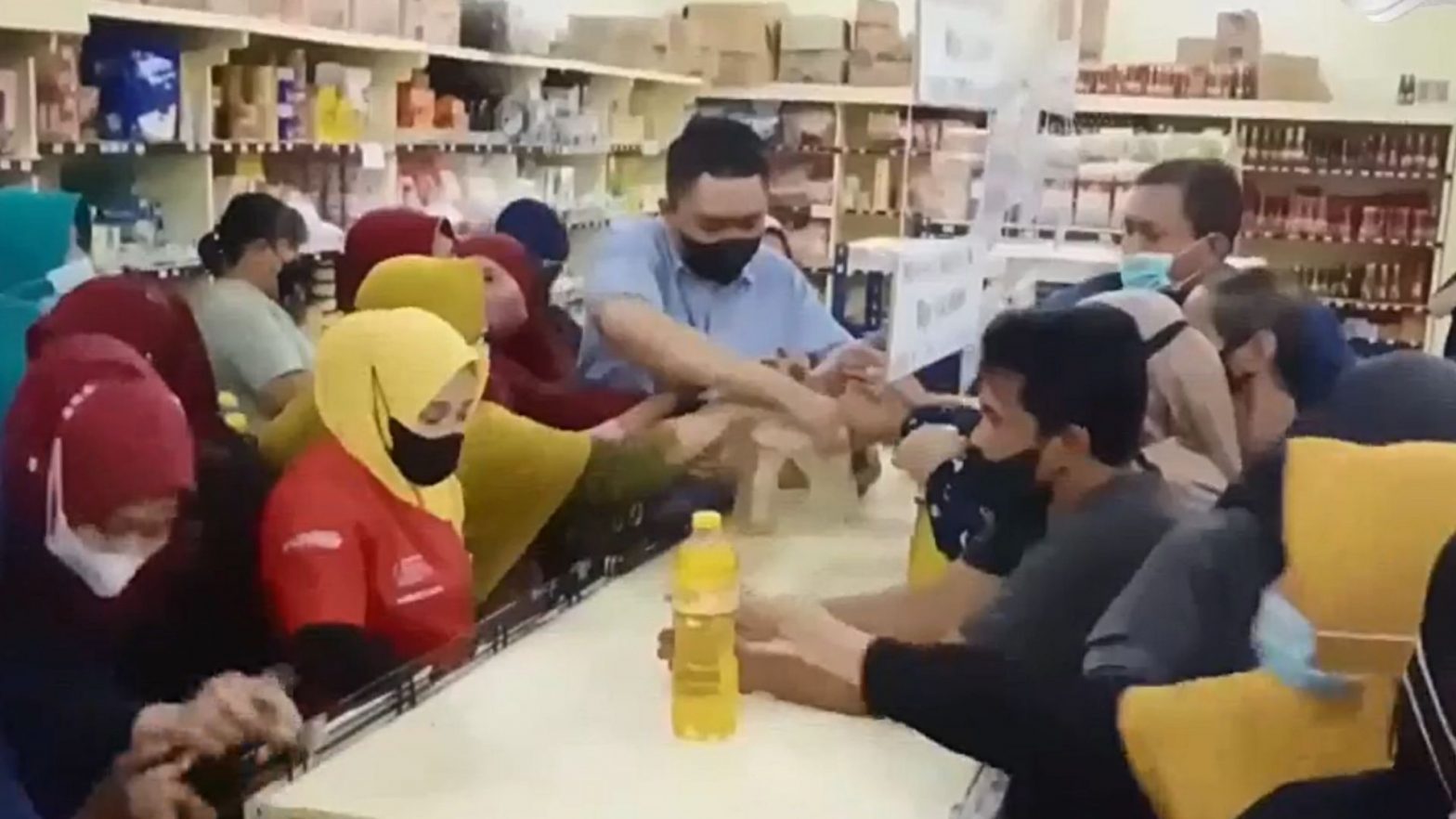 Sejumlah Emak-emak ini rela mengantre dan berdesakan demi membeli minyak goreng di Pasar Wonomulyo, Polewali Mandar, Sulawesi Hal itu dikarenakan mulai langkanya minyak goreng di Polewali Mandar. Menurut pedagang, kelangkaan terjadi karena kendala pembayaran subsidi.