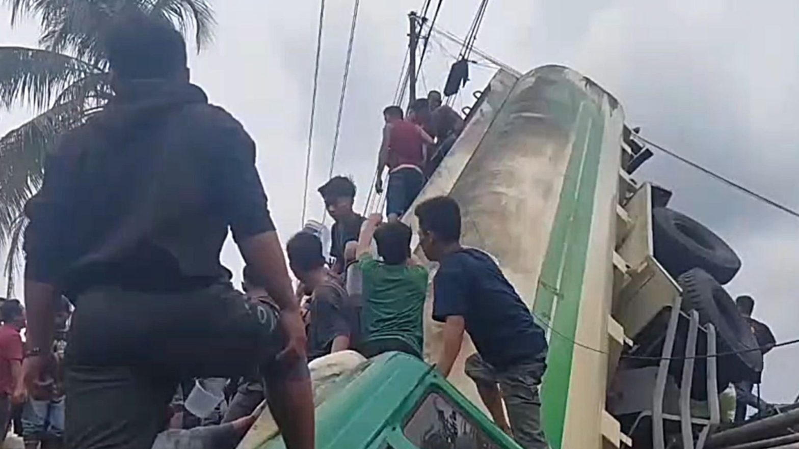 Truk tangki bermuatan minyak goreng terjungkal hingga masuk ke sungai di Kecamatan Tebing Syahbandar, Kabupaten Serdang Bedagai, Sumatra Utara. Kecelakaan terjadi akibat sopir truk minyak hilang kendali karena mengalami cedera kaki, usai menabrak truk lain. Insiden itu membuat arus lalu lintas macet, sementara warga beramai-ramai mengambil muatan minyak goreng yang tumpah dari truk.