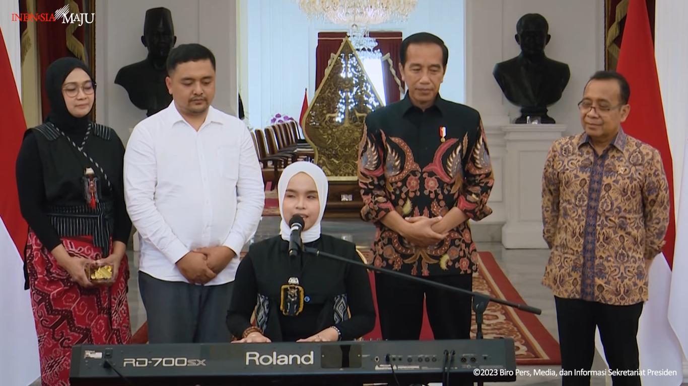 Putri Ariani, penyanyi yang mendapat golden buzzer dari Simon Cowell di America’s Got Talent, bertemu Presiden Jokowi, di Istana Negara. Nggak hanya bertemu, Putri juga unjuk kebolehan, dan menunjukkan golden buzzer yang didapat dari ajang pencarian bakat America’s Got Talent ke Presiden Joko Widodo.