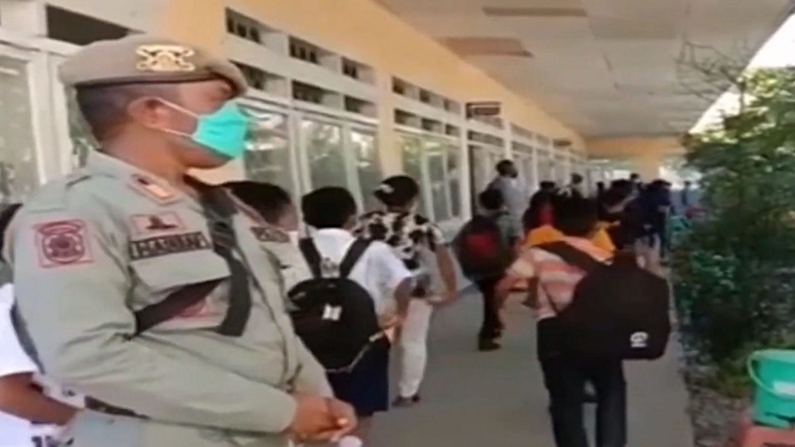 Petugas Satpol PP membubarkan kegiatan sekolah tatap muka di SMA Bhaktyarsa, Maumere, Kabupaten Sikka, Nusa Tenggara Timur. Tindakan itu dilakukan, karena Maumere, NTT masih menerapkan PPKM Level 4 yang melarang kegiatan belajar tatap muka.