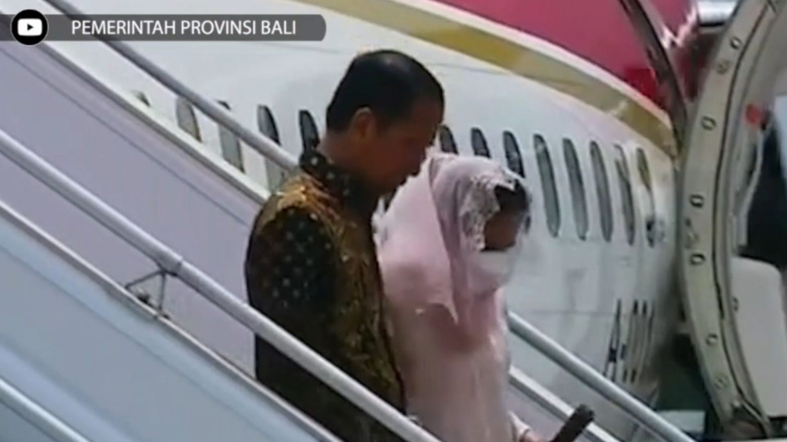 Ibu Negara Iriana Jokowi sempat terjatuh saat menuruni tangga pesawat, Senin (14/11). Anggota Pasukan Pengamanan Presiden (Paspampres) langsung membantu Ibu Negara. Kejadian itu terjadi saat Presiden Jokowi dan Ibu Negara tiba di Bali usai peresmian Masjid Sheikh Zayed di Solo.