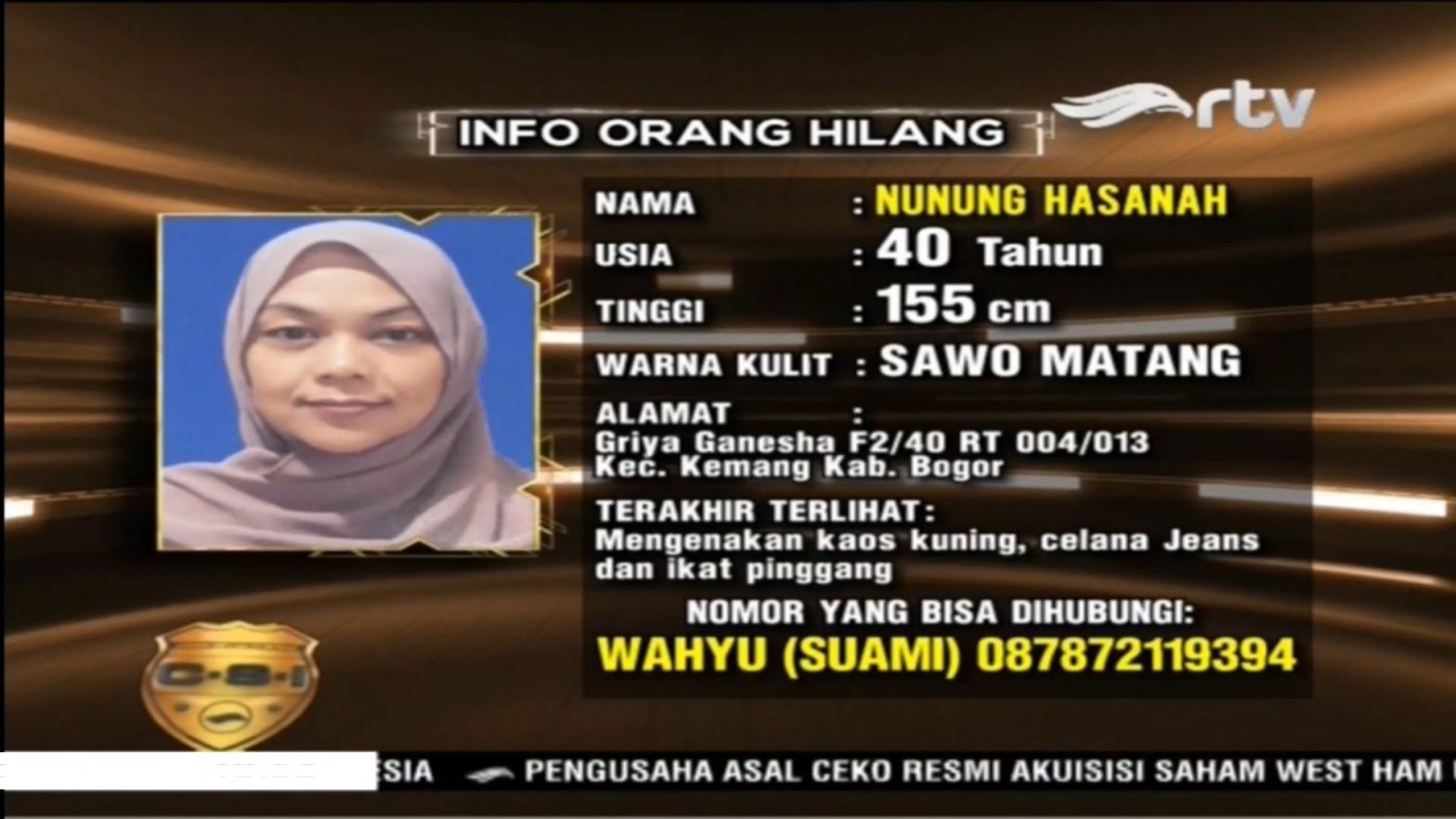Nama : Nunung Hasanah Usia ; 40 Tahun Tinggi : 155 cm Warna Kulit : Sawo Matang Alamat : Griya Ganesha F2/40 RT 004/RW013 Kecamatan Kemang, Kabupaten Bogor, Jawa Barat Terakhir terlihat mengenakan kaos kuning, celana jeans, dan ikat pinggang Nomor yang bisa dihubungi : 087872119394 (WAHYU/suami)
