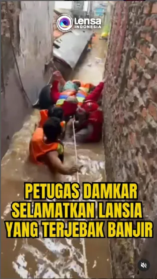 Seorang lansia yang terjebak banjir di Rawajati, Pancoran, Jakarta Selatan, diselamatkan oleh petugas pemadam kebakaran, Selasa (4/3). Penyelamatkan terhadap nenek dilakukan dengan menggunakan karet ban dan jaket pelampung. Kini, nenek tersebut telah dibawa ke tempat yang aman. #damkar #lansia #banjir #pancoran #jakartaselatan #pelampung #nenek