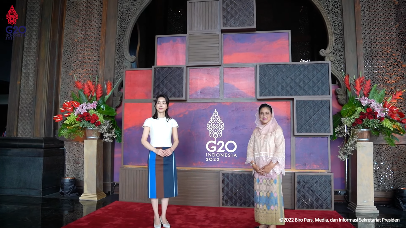 Ibu Negara Iriana Jokowi mengajak Ibu Negara Korea Selatan Kim Keon-hee melihat sejumlah penampilan budaya Indonesia, seperti Gamelan Bali dan Tarian Penyambutan Panyembrama, Senin (14/11). Penampilan Ibu Negara Korea Selatan, Kim Keon-hee sering mencuri perhatian warganet. Dirinya sering disebut sebagai Ibu Negara paling stylish dalam sejarah Korea. https://fb.watch/gOJ7kd0Q2S/