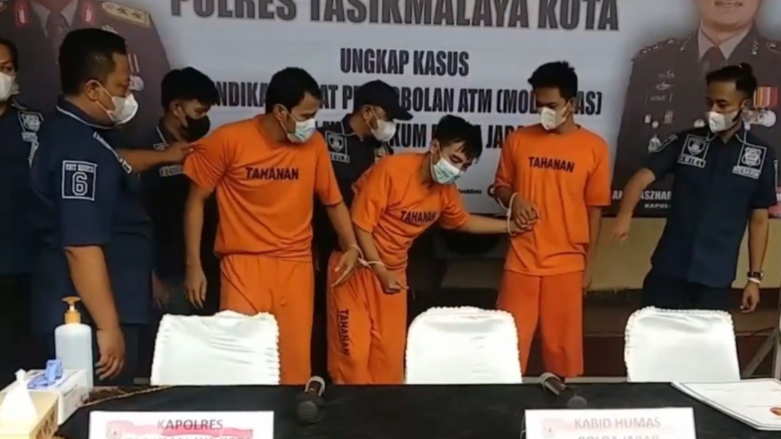 Satreskrim Polres Tasikmalaya menangkap tiga pelaku pembobolan mesin anjungan tunai mandiri (ATM) di dalam sebuah minimarket, di Jalan Perintis Kemerdekaan, Kelurahan Sambongjaya, Kecamatan Mangkubumi, Kota Tasikmalaya, Jawa Barat. Ketiga pelaku diketahui merupakan komplotan spesialis pembobol ATM di dalam minimarket. Selain menangkap pelaku, polisi juga mengamankan sejumlah barang bukti.